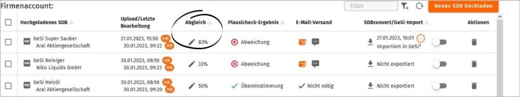 • Ab sofort können Sie den Abgleich-Stand Ihres Sicherheitsdatenblattes direkt in der MeinSDBcheck®-Oberfläche einsehen: