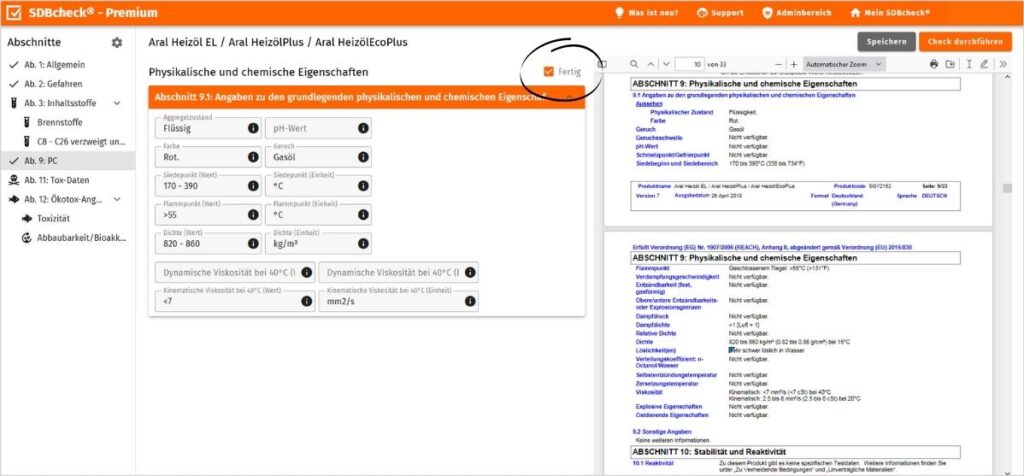 • Jeder Abschnitt, der für die Plausibilitätsprüfung relevant ist, kann nun mit einem Haken als “fertig abgeglichen” gesetzt werden. Im Mein SDBcheck® Bereich können so auch Werte zwischen 0 und 100 % erhalten werden.
